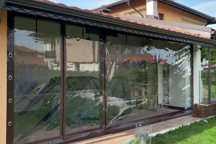 Windproof curtains are manufactured from clear (transparent PVC) crystal material framed with PVC vinyl, made entirely from PVC vinyl, or, in some cases, from acrylic fabric. We also produce custom projects with different fastening and mounting solutions depending on the client's requirements.